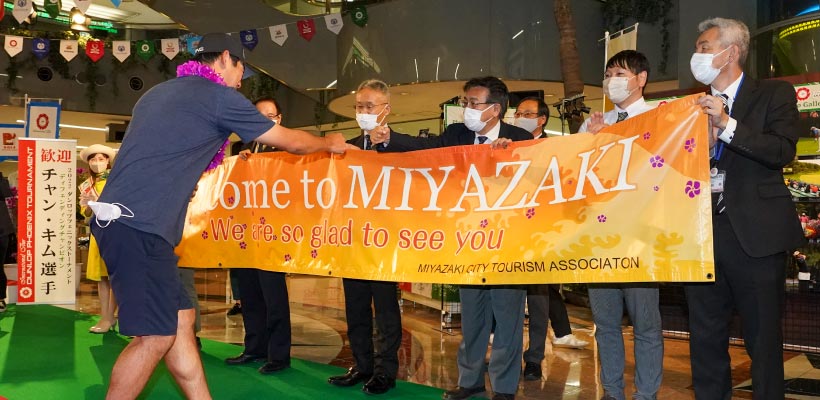 盛大に歓迎されたチャン・キムに花束を贈呈したのは、宮崎サンシャインレディ 篠原 心花(ここか)さん。そして、歓迎挨拶と記念品贈呈は、宮崎市観光協会の片桐孝一副会長によって行われた。
