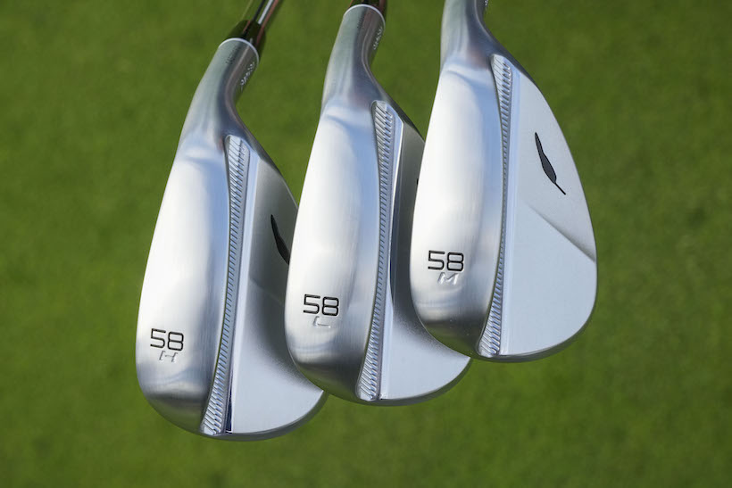 ロフト58度のモデルはバンカーの砂、グリーン周りの芝質、さらにはプレーヤー個々の入射角に対応できるよう、同じソール形状にH(ハイバンス)、M(ミッドバンス)、L(ローバンス)の3種類のバウンス角を用意した。入射角が大きめでターフをとるタイプならH(ハイバンス)、入射角が緩やかであまりターフをとらないタイプにはL(ローバンス)が向く。