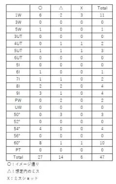 最後に、私はラウンドで使ったクラブの評価をエクセルで集計しています。ラウンドでどのクラブを何回使っているのか、クラブ毎のショットの評価の傾向を確認できます。