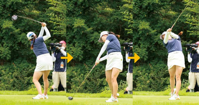 勝 みなみ「小さな体で長いドライバーを振り下ろす際、少しでも振り遅れるとクラブフェースが開いたままインパクトを迎えます。その遅れを取り戻すためにオープンスタンスにしていました」。