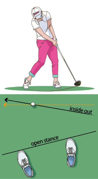 オープンスタンスに構え、インサイドアウトの軌道でクラブを振ることにはリスクが伴う。どこに振り抜くのかを明確にすることが大切。