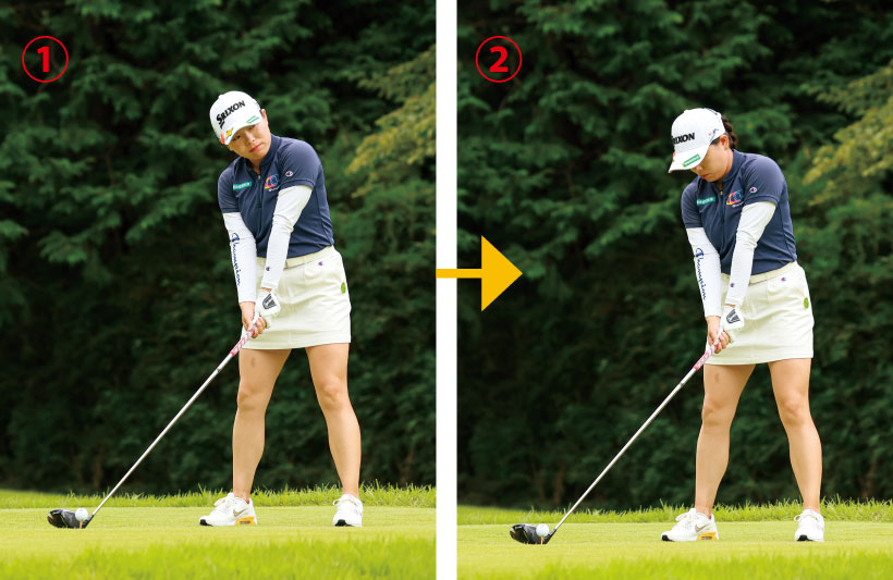 勝 みなみ「体を回転するスピードが速くなってきたので、スクエアスタンスだとボールを右に打ち出すようになったのです。スイング軌道を変えるよりもスタンスの向きを変えた方がいいと思い、オープンスタンスに戻しました」