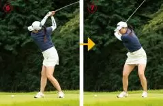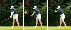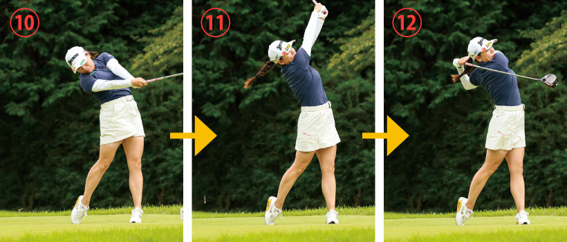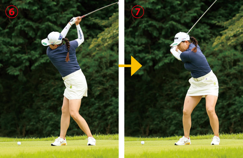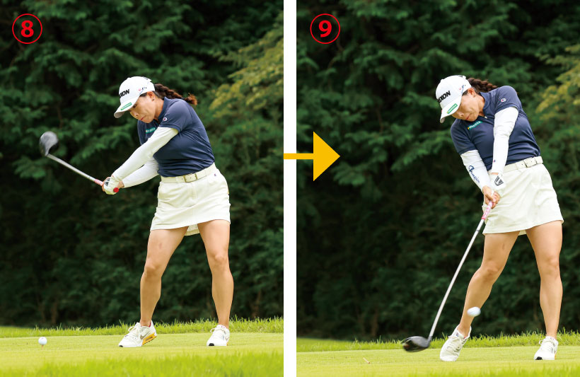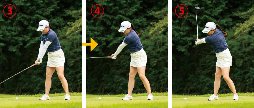 腰を素早く左に回転しながら、クラブをインサイドから下ろしてくる。アウトサイドからクラブは下ろさない。