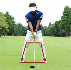 まずはアドレスで両ヒザを軽く開き、左右の骨盤と両ヒザ、両足を結ぶ台形をイメージして構えてください。スイング中はこの両ヒザをなるべく動かさないようにしましょう。