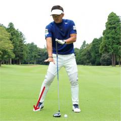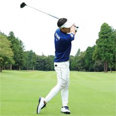 上体と下半身を絞るイメージで大きな捻転が生まれて、トップでも力感のあるフォームが作れます。ポイントは右手と左ヒザが引っ張り合うイメージでクラブを上げること。一見コンパクトに見えるトップでも背中が目標方向を指し、左ヒザがアドレスの位置からあまり変わっていなければカラダに「きつさ」が感じられます。このプレッシャーがパワーの原動力となるのです。