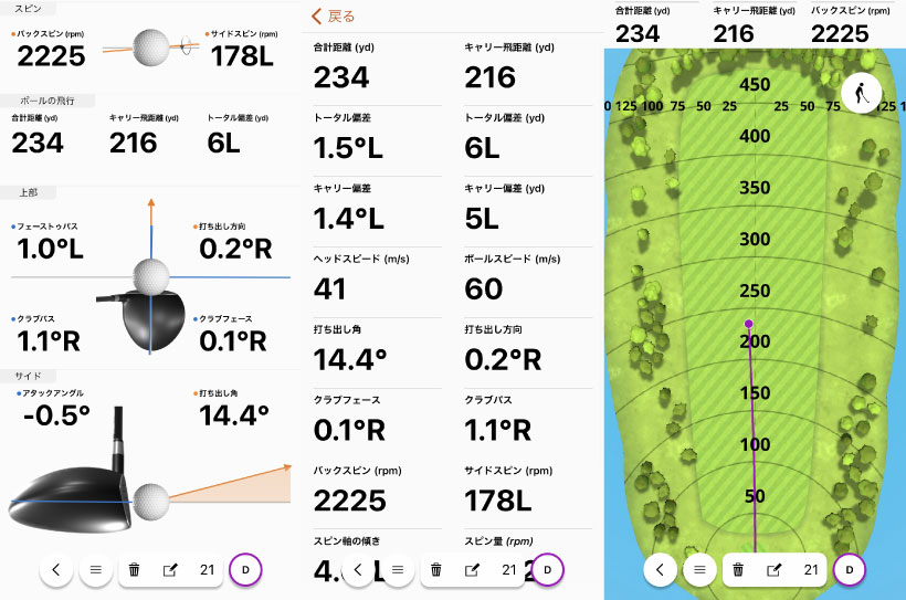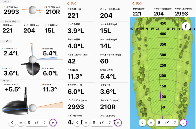 このときのショットは少しアッパーに打てていますが、アウトサイドイン軌道で左に飛び出し、少し右に戻る球。スピン量も多めですね。ヘッドスピードもボール初速も他の計測器で測ってもこんな感じなので、けっこういい数値が出ていると思います。実際の弾道にも近い感じですね。