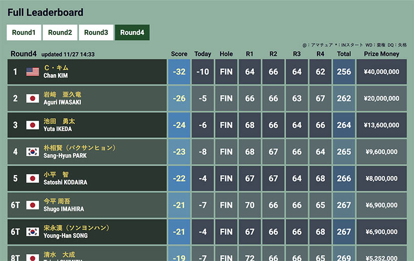 11月のカシオワールドオープンで優勝したチャン・キムが叩き出した32アンダーというスコアは衝撃的だった。従来の28アンダー(2014年トーシントーナメント、I・H・ホ)を4打も更新する最多アンダー記録だったのだ。
