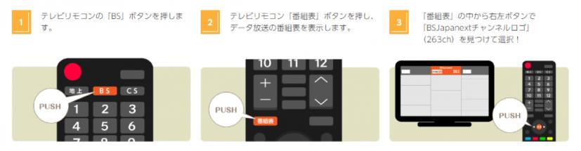 ③「番組表」の中から右左ボタンで 「BSJapanextチャンネルロゴ」(263ch)を見つけて選択