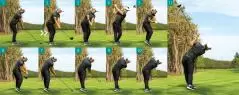ダウンスイングでは骨盤を水平に回しながら、上半身を回して行くと、右肩が高い位置にキープできる。顔の向きが変わらないのも理想的。