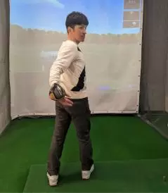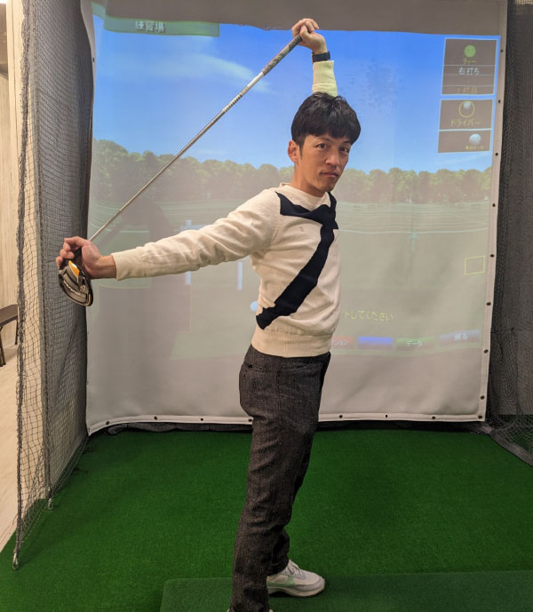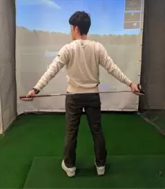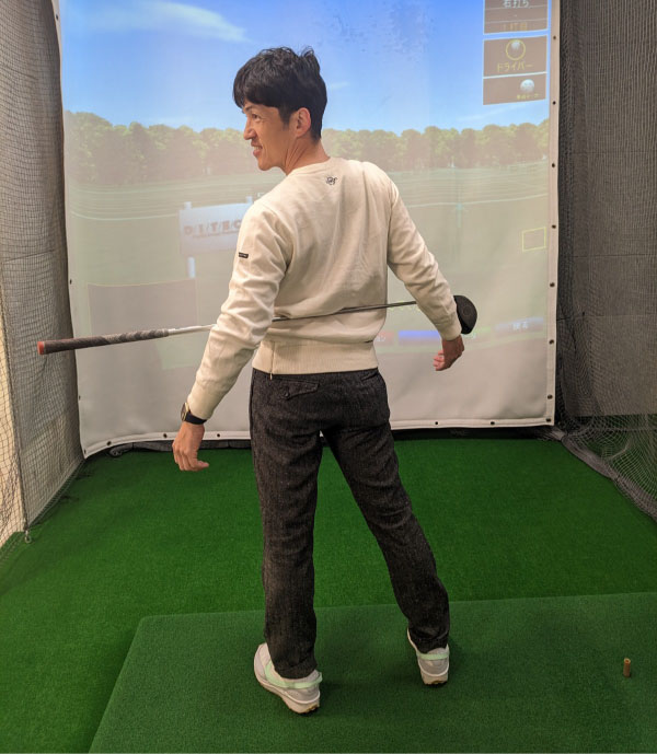 その日最初のティーショットを打った後は、ドライバーを後ろ手に持って、頭の上から腰のあたりまで上げ下げをして肩甲骨周りの筋肉を伸ばすようにしています。