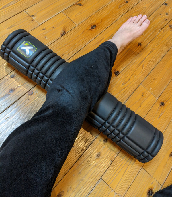 背中の広い面を中心にゴロゴロ転がることで固まった筋肉をほぐします。また、腿などもローラーの上で体重をかけてイタ気持ちいい負荷をかけることで筋肉をほぐしていきます。