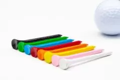 ティーペグ(ゴルフティー)の素材は木製、プラスティック製、ゴム製が一般的です。前項の長さ同様、どの素材のティーペグを使ってもかまいません。