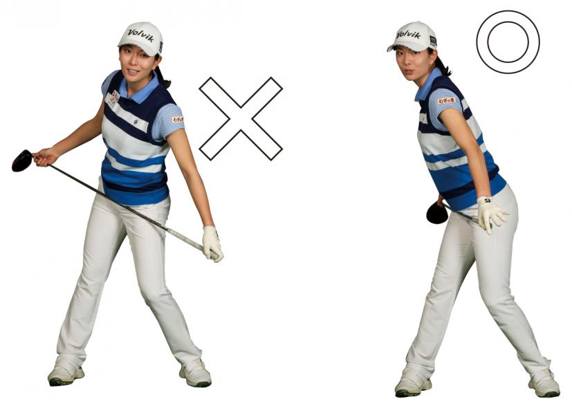 頭の位置を変えないように体を回すと体が傾いてしまうので、頭の位置は右足の前まで動かしたほうが上半身を回転させやすい。