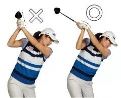 〇: トップで左手を掌屈(手のヒラ側に折る)させると、フェース面が真上を向いてスクエアフェースになる。