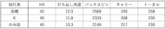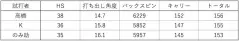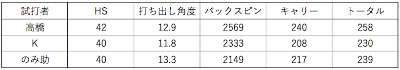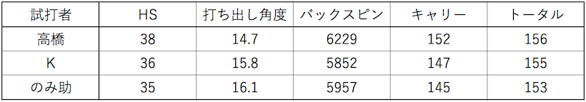 「K」 全員、計測は10球以上打って行いましたが、計測結果の中から1球ずつ抜き出したのが上の表です。