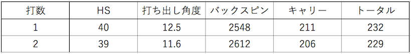 「K」 たいした飛距離ではないですが、ちょっと見栄を張りたくなってしまいました。僕の普段の打ち出し角度は11〜12度台、バックスピンは2500〜2600なので少し減っていますね。キャリーは、このデータで言えば、寒くない時期の一番良い当たりのときの距離という感じです。まとめると、こんな感じですかね。