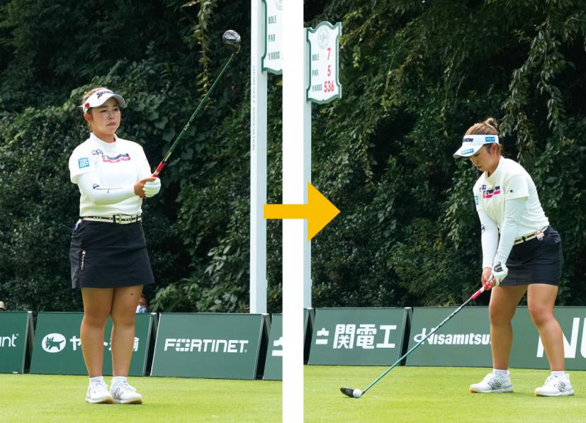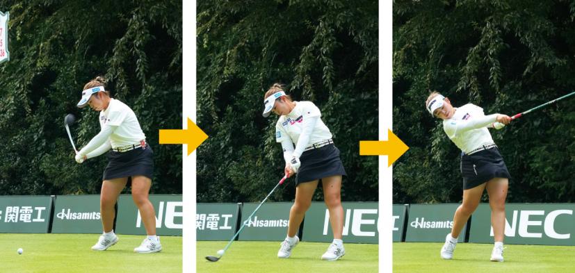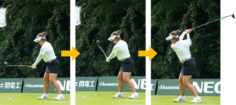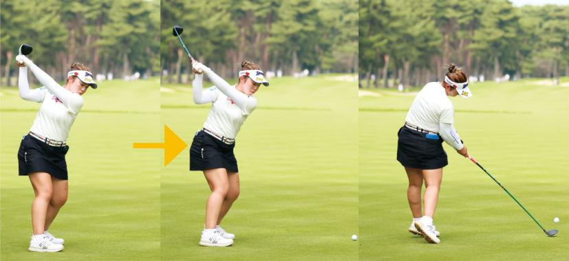 山下美夢有「それを防ぐために、下半身リードで間を作る感じですね。トップで間を置きながら、上半身と下半身を連動させて動かすイメージです」と山下。