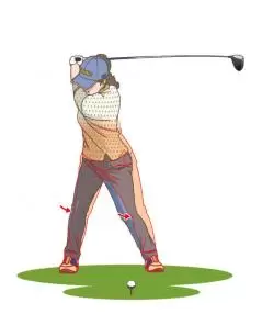 まだ上半身はバックスイングを行っているが、下半身はひと足先に左足に体重移動を始める。