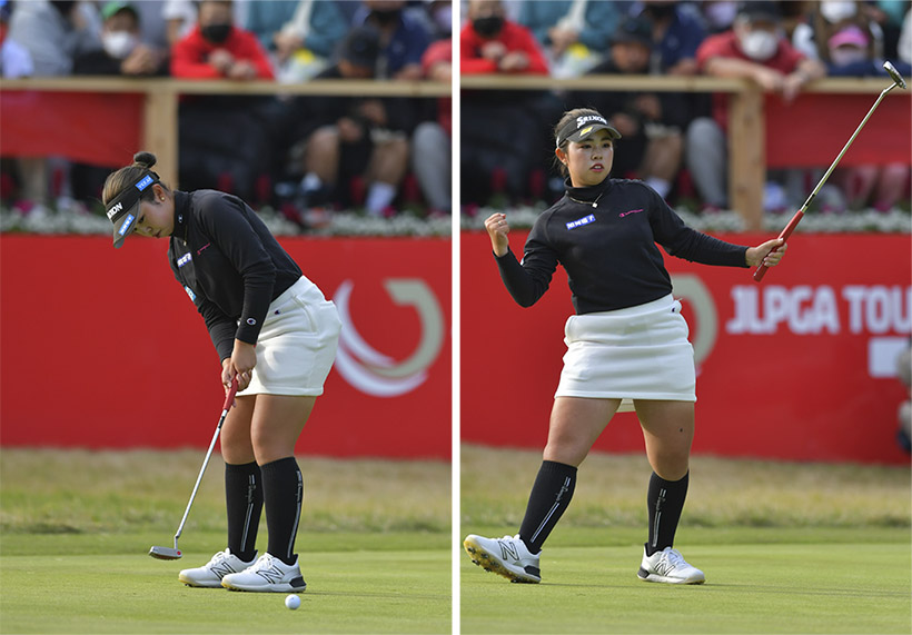 もう一つ、山下選手のスゴさをまざまざと見せつけられたのはミヤギテレビ杯ダンロップ女子オープンの初日です。青木選手と菅沼菜々選手と同じ組でのプレーでしたが、この日の山下選手は60というツアー新記録達成。12バーディ、ノーボギーでパット数は何と22パット。パーオンホールの平均パット数が4位ですからパットが巧いのは当然とはいえ、長いパットも短いパットも全部入ってしまうのは驚愕のひと言。1ラウンドあたりの平均パット数で2シーズン連続1位の青木選手もお株を奪われてしまった感がありました。