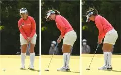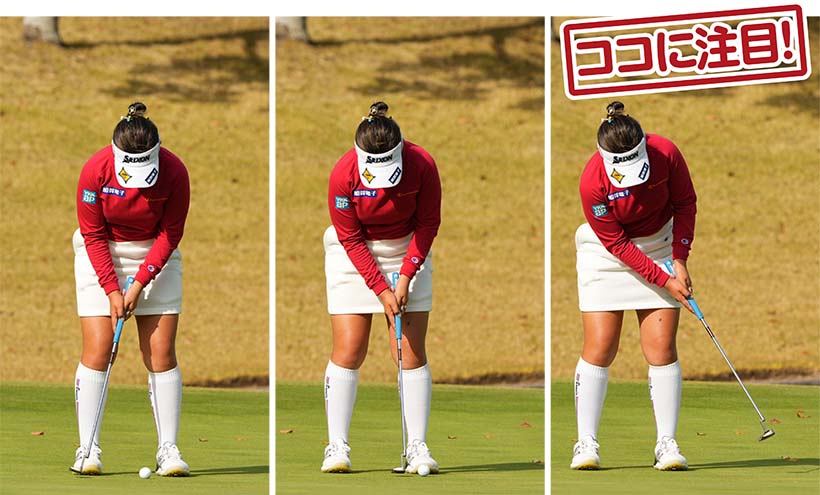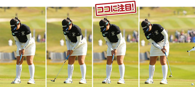 山下選手のパットの長所は構えたときの両肩、両腕の五角形と手首の角度がストローク中もまったく変わらないこと。そしてパターヘッドを低くい長く出していくフォロースルー。パットはラインをイメージしてしっかり打つことが大事で、山下選手はその点でもラインに対する集中力とか、アドレスを丁寧に作るなどライン乗せるための準備がスゴイ! と思いましたね。