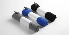 付属のカラビナでゴルフバッグに取り付けられる愛媛県今治産のタオルです。吸水速乾性に優れており、汗をよくかく方や雨の日のラウンドで使う場合に適しています。