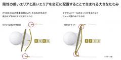 たわむエリア(軟)をより軟らかく、支点となるエリア(剛)をより硬くすることで、大きなたわみを生み、反発性能が向上
