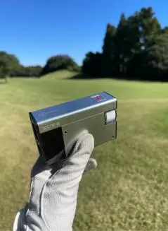 従来のレーザー距離計だと、ボール地点まで行って距離を計測していたが、ボールから離れた位置からも測ることができるため、カートに乗ったまま離れた場所にいる同伴者のサポートも可能となっている。これは、かなりの優れものでは?