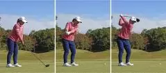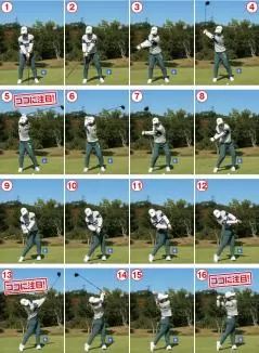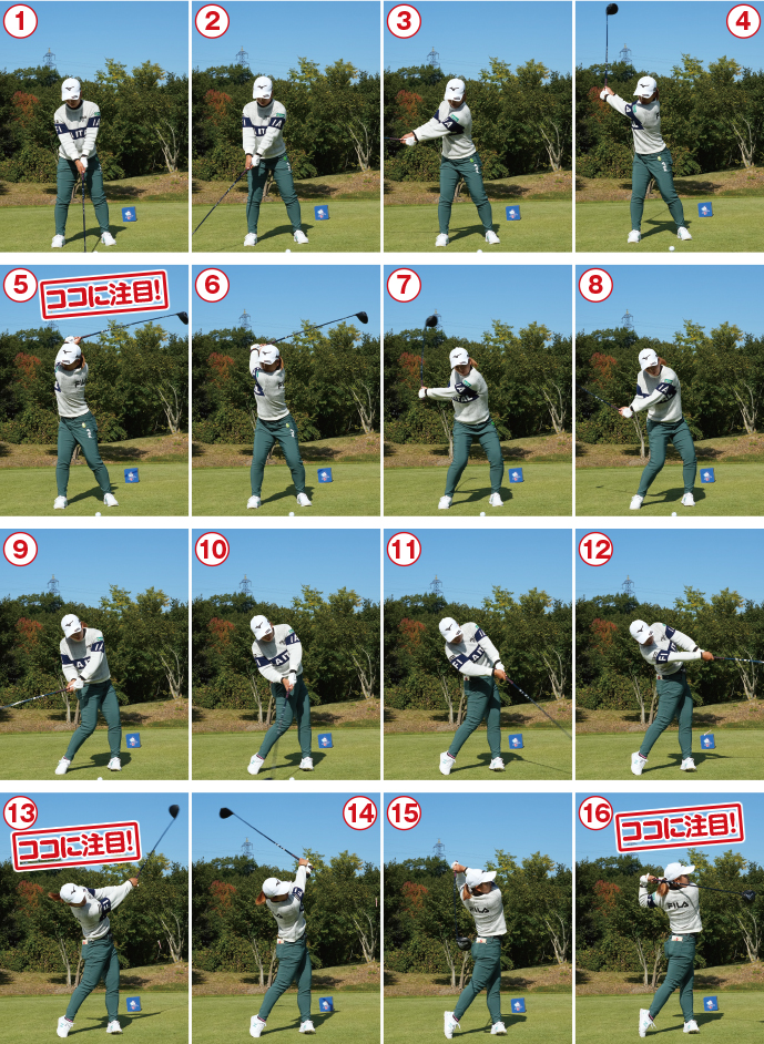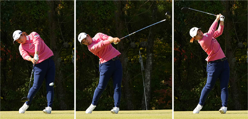 西郷選手はドライバーが巧い選手で、20~21年の統合シーズンのドライビングディスタンスは246.33ヤードで10位。フェアウェイキープ率は23位。ドライビングディスタンスとフェアウェイキープ率の順位を足した数値でドライバーの総合力を表すトータルドライビング部門は1位でした。西郷選手のドライバーの連続写真をつなげるように見て、映像でイメージしてみてください。スイングにまったく緩みがなくて、体幹をフルに回転している感じが伝わってくることと思います。