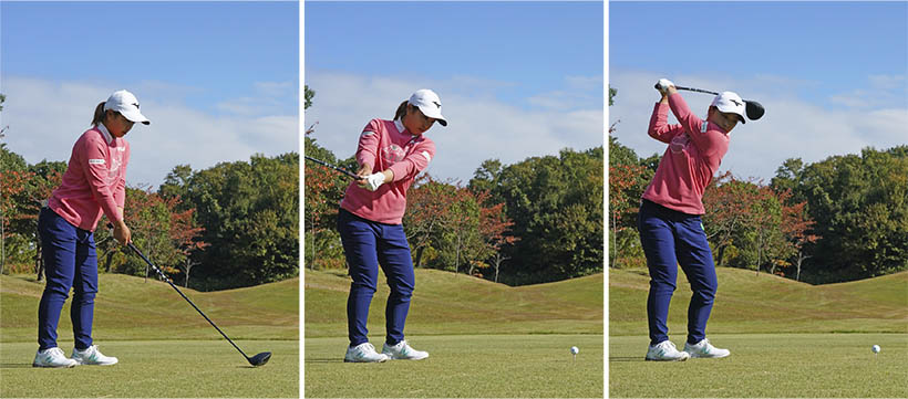 スゴイ! と思ったのはもう一つあります。それは切り返しからフィニッシュに至るまで左足がほとんど動いていないことです。インパクトで左足がめくれたり左ツマ先が回ってジャンプアップしたりすることなく、最後まで左足の裏が地面をしっかりとつかんでいます。そして振り抜いた姿勢のまま、バランスよく立っていられる。下半身の強さを活かすには足を積極的に動かすタイプと、西郷選手のように足の動きを抑えて「我慢」をパワーに転換するタイプがいます。トライバーが飛ばないと悩んでいる方は西郷選手のアドレスを参考にして狭めスタンスで構え、両足が動きすぎないように我慢させるつもりでスイングしてみるといいと思います。
