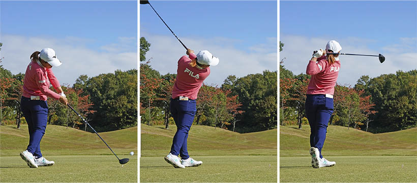 トップの深い捻転とインパクト後の右足の我慢がビッグキャリーを生む
