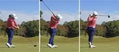 スタンスが狭めで、すっと立つ感じのアドレスがまさに自然体。そして構えたときの両肩と両腕の三角形がスイング中もほとんど崩れていない。三角形キープの見本のようなスイングです。バックスイングでも三角形を崩さずに、トップで肩を90度以上も回しています。それでいて左ヒザがアドレスの位置とあまり変わっていません。腰の回転角度は45度以下、肩は90度以上。この腰と肩の大きな捻転差がビッグキャリーを生み出すパワーの源です。