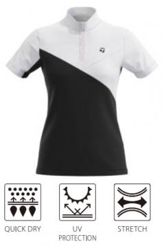 アシンメトリーデザインがシャープな印象のショートスリーブジップドポロ。フロントジッパー部分には、テーラーメイドロゴをソースとしたグラフィックデザインが入る。