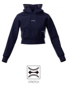 上品なスウェット素材をベースに、フード部分をストレッチナイロン素材で補強している。