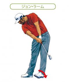 森プロ「左足がめくれるラームの動きは一見スピンアウトしそうですが、ベタ足気味の右足がスイング軸を支え、シャローイングで背中側から振り出すヘッドの遠心力と上手く拮抗しています」