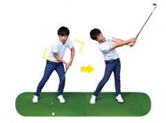 このとき注意したいのは、左右対称に振ること。コックの角度までトップとフィニッシュで同じにし、あくまでも左右対象で半円の運動をする感じを忘れずに!