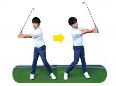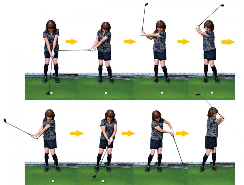 このとき注意したいのは、左右対称に振ること。コックの角度までトップとフィニッシュで同じにし、あくまでも左右対象で半円の運動をする感じを忘れずに!