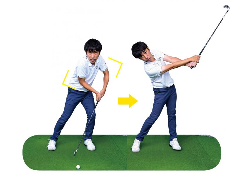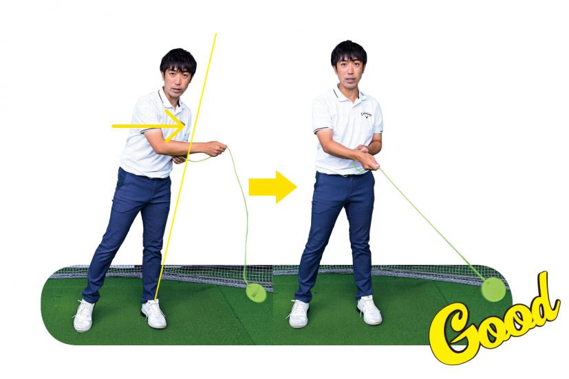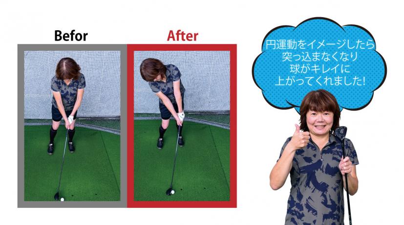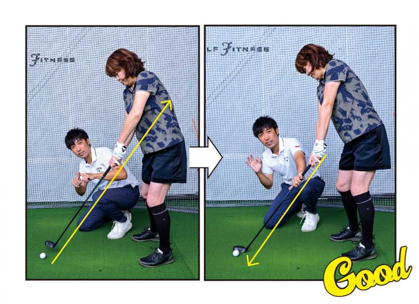 (右写真)逆にクラブのヘッドを球に落としてあげるイメージでいい!
