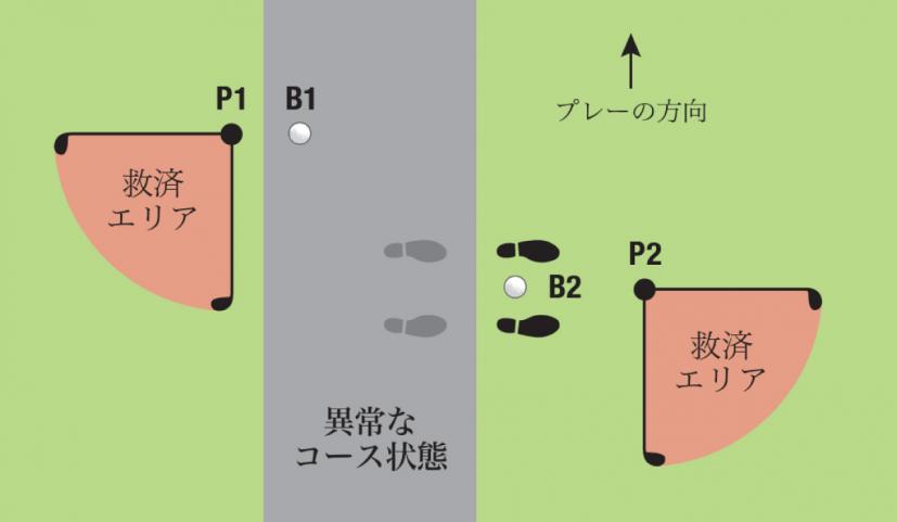 ボールが下の図のB1に止まっている場合には、ニアレストポイントをP1とし、1クラブレングスの救済エリアにボールをドロップします。ボールがB2にあった場合には、スタンスがカート道路にかかりますので、ニアレストポイントをP2とし、1クラブレングスの救済エリアにドロップします。