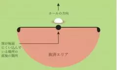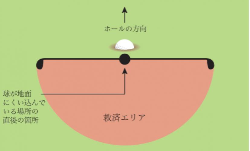 ボールが地面に食い込んでいる場合の救済方法です。ボールが地面に食い込んでいる場所の直後を基点として、1クラブレングスの救済エリアを設定しドロップします。