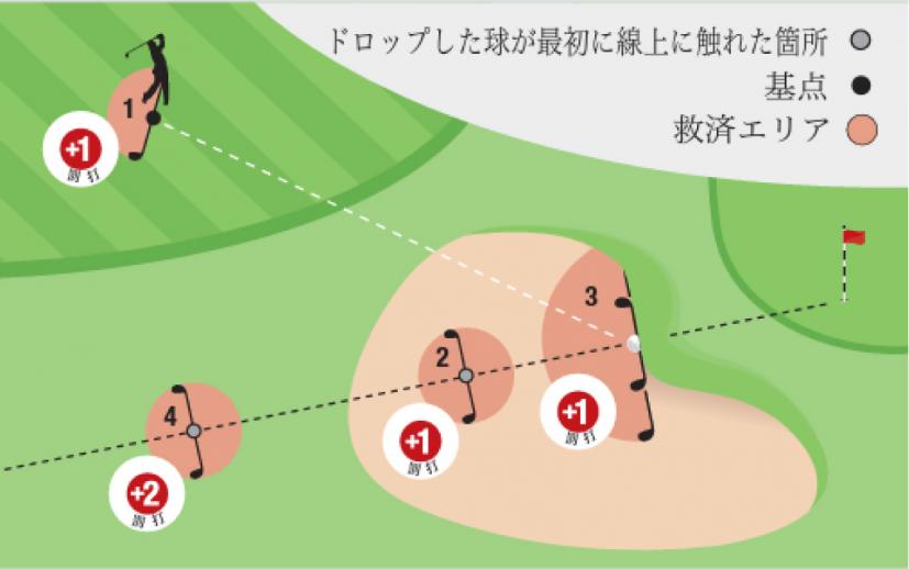 (4)合計2罰打で、プレーヤーはバンカーの外で後方線上の救済を受けることができる