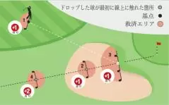 ● 直前のストロークを行った箇所を基点に、1クラブレングスの救済エリアにドロップ