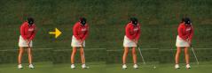ボールに5、6センチ近づくことで、上体が起き上がり、それにつれて手元の位置も高くなる。
