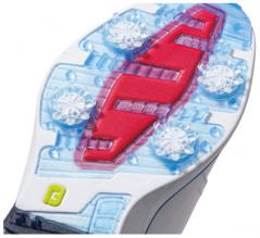 特徴は、ゴルフ界では昨今話題の素材となっているカーボンを上手に使っている点。ソールの土踏まず部分にカーボンパーツがガツっと入っており、これが未体験の安定感をもたらしてくれる。