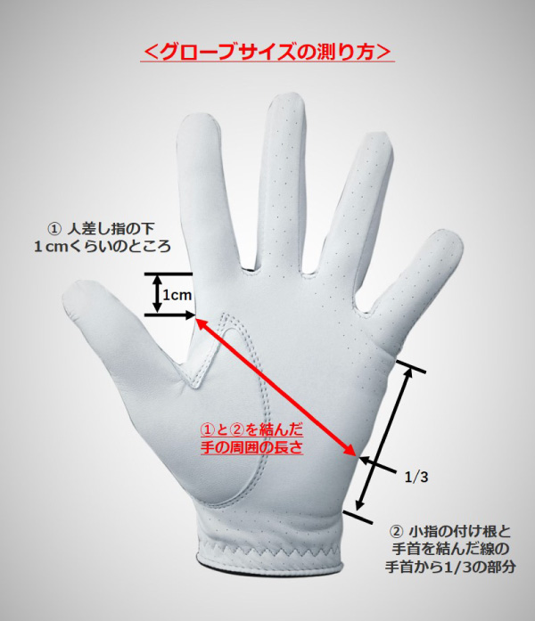 多くの人は指の長さだと思っているようで、「オレは指が長いから25cm」(一般的にメンズグローブは、21~26cmの1cm刻みになっている場合が多い)といった感じでグローブを選んでいるようですが、実は指の長さではありません。
