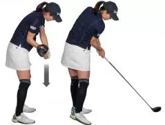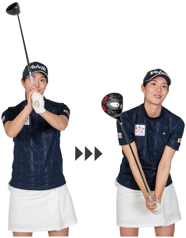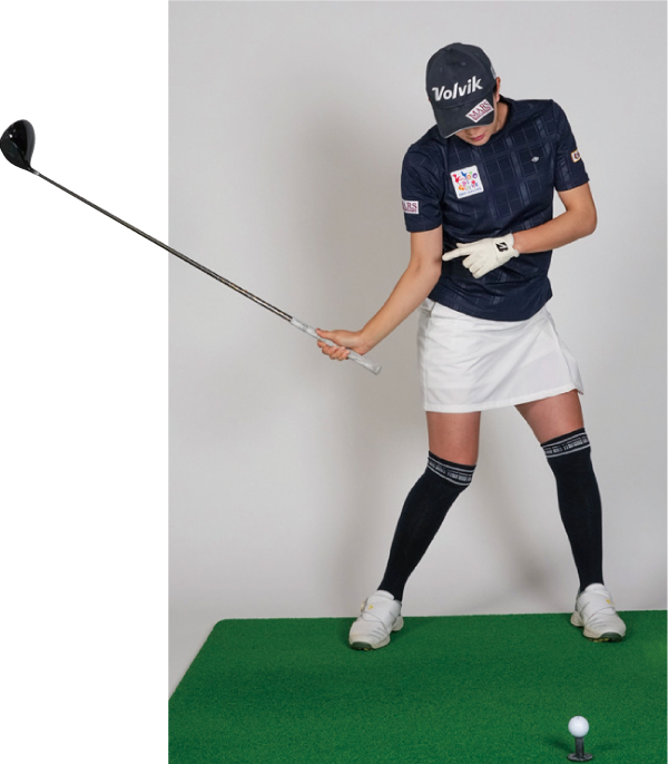 一方、クラブは完全にタテ振り。クラブをヨコ回転させようとするとフェースが開いたり、ロフトが寝てしまうため飛距離をロスしてしまいます。クラブをタテに下ろせば、ロフトを立てることができるのでボールスピードを上げることにつながります。