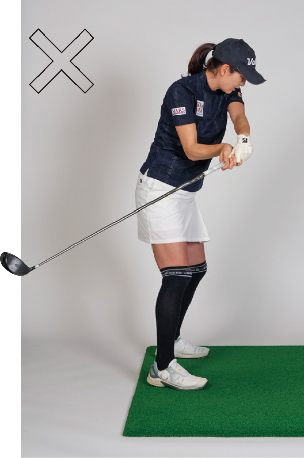 クラブがヨコ振りになってしまうと、シャフトが寝てしまうので、インパクトロフトが増えたり、スライスする原因になる。