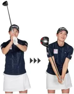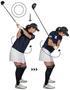 体がヨコ回転しても、タテ方向にコッキングすればクラブはタテ振りになる。