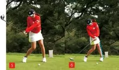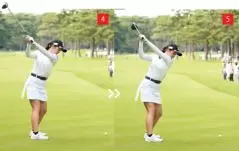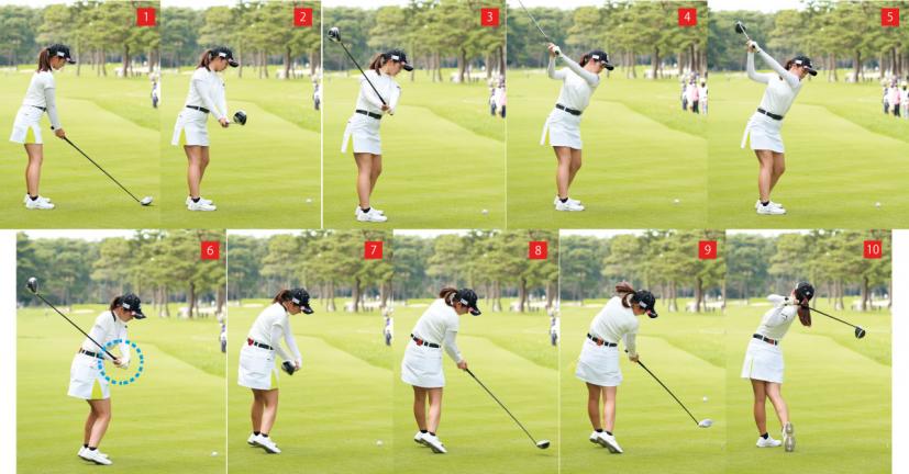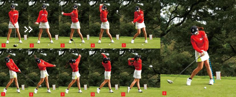 川﨑選手はヒジから先は脱力していますが、下半身の動きは力強くて、左足を踏み込んだときに手元やヘッドの動きが少し遅れます(写真6)。このズレがあることで下半身リードのスイングで打てるのです。