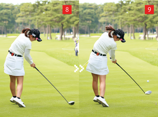 インパクトからフォロー(写真8、写真9)にかけては両足のカカトが浮くくらい強く蹴っている。