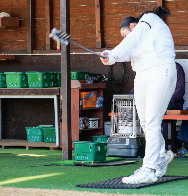 ーー当日のセレクションは、各自ミドルアイアン、ドライバー、80ヤードのショット、羽根の付いた特殊な素振り用シャフトを振る、というメニューで進められた。